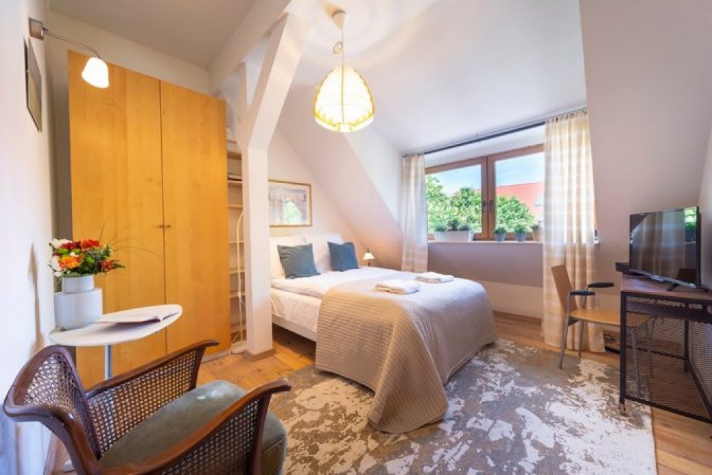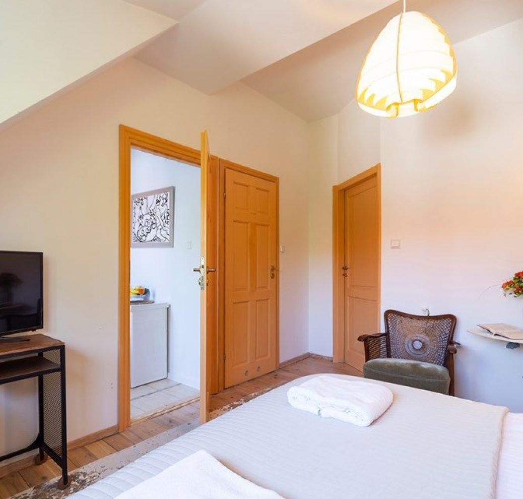 W apartamencie znajduję się łóżko małżeńskie