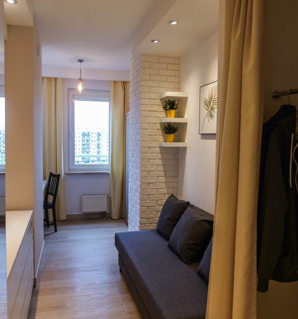 POKÓJ 12 M. KW.: rozkładana sofa, szafa na ciuchy z drzwiami lustrzanymi, szafa wnękowa, podwójna komoda, wiszące półki, biurko regulowane na wysokość, regały, zaciemniające rolety okienne na dwóch oknach, gniazdo RTV, etc;