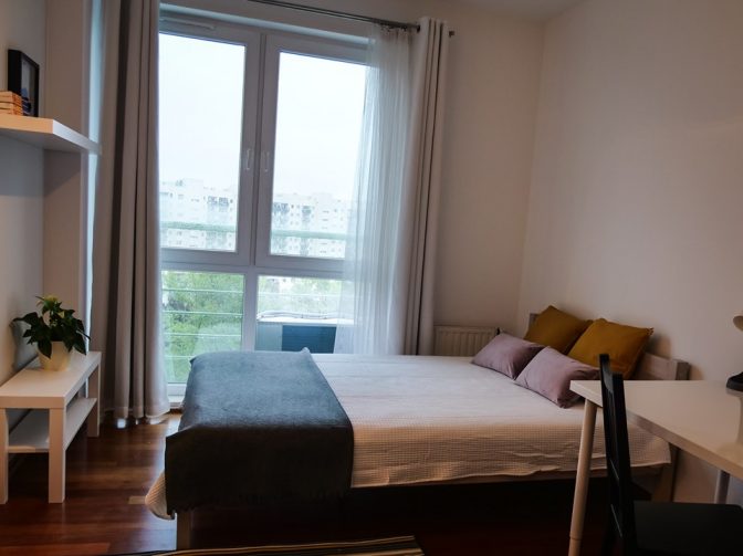 POKÓJ 12 M. KW.: rozkładana sofa, szafa na ciuchy z drzwiami lustrzanymi, szafa wnękowa, podwójna komoda, wiszące półki, biurko regulowane na wysokość, regały, zaciemniające rolety okienne na dwóch oknach, gniazdo RTV, etc;