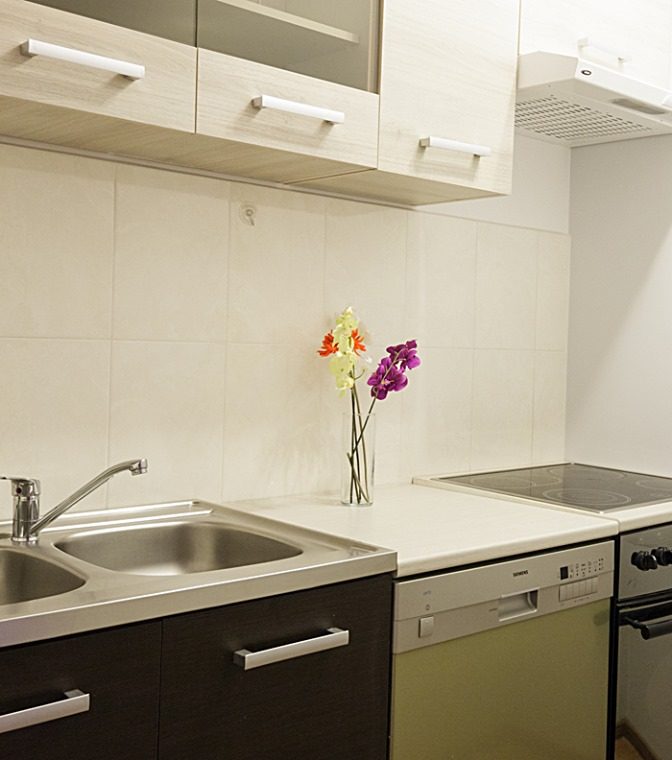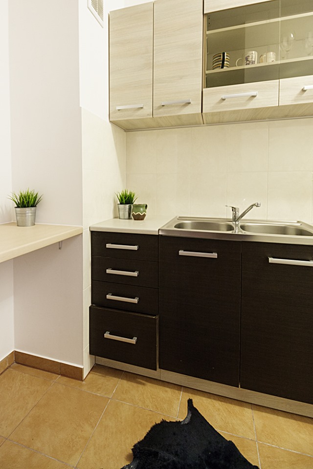 KUCHNIA: ceramiczna płyta z 4 palnikami, lodówko-zamrażarka, piekarnik, czajnik, mikrofalówka, okap, zmywarka, podstawowe wyposażenie (garnki, sztućce, naczynia, deski do krojenia, noże i inne przybory kuchenne).