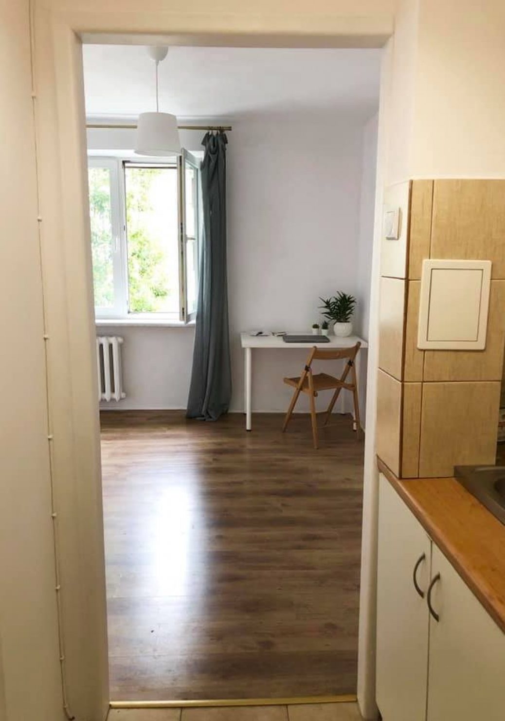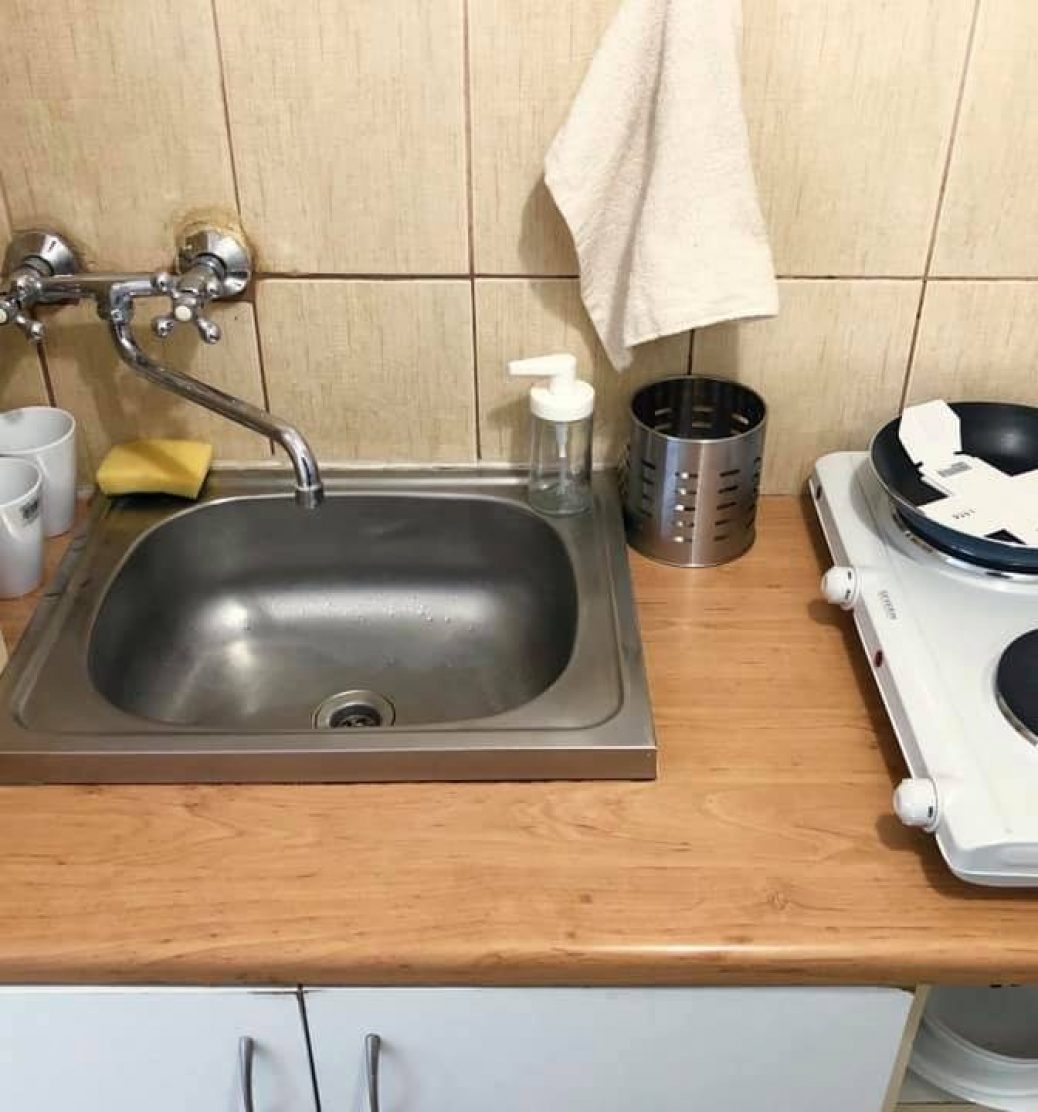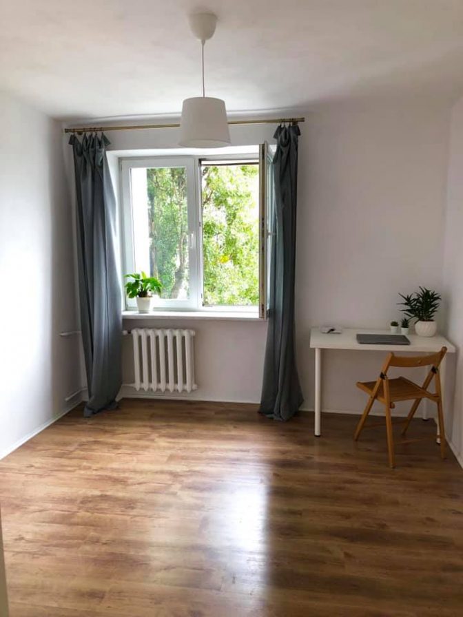 Łazienka wyposażona jest w wannę, umywalkę z lustrem oraz sedes. Kuchnia posiada dwu-palnikową kuchenkę elektryczną oraz zupełnie nową lodówkę. W mieszkaniu zostaną wymienione drzwi wejściowe na zupełnie nowe w ciągu kilku dni. W pokoju znajduje się okno z widokiem na drzewa oraz ulice Ostrobramską.