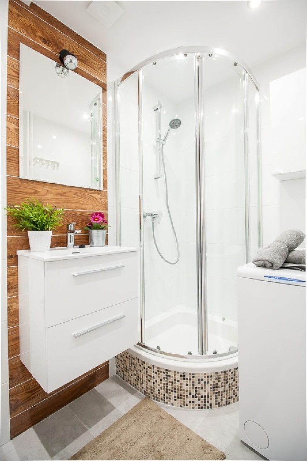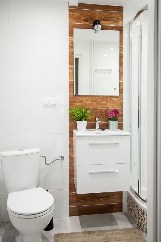 ŁAZIENKA Z WC: Utrzymana w nowoczesnym stylu w kolorystyce biało brązowej. Jest w niej przestronna, przeszklona kabina prysznicowa wraz z brodzikiem, umywalką, WC, pralką, szafką oraz wieszakami.