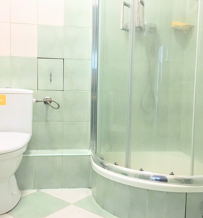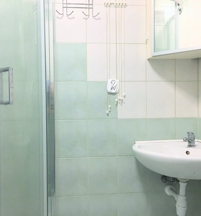 W łazience kabina prysznicowa, wc, umywalka oraz pralka, a także szafki na drobne przedmioty.