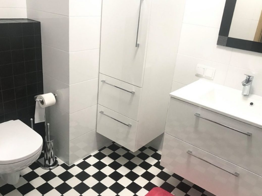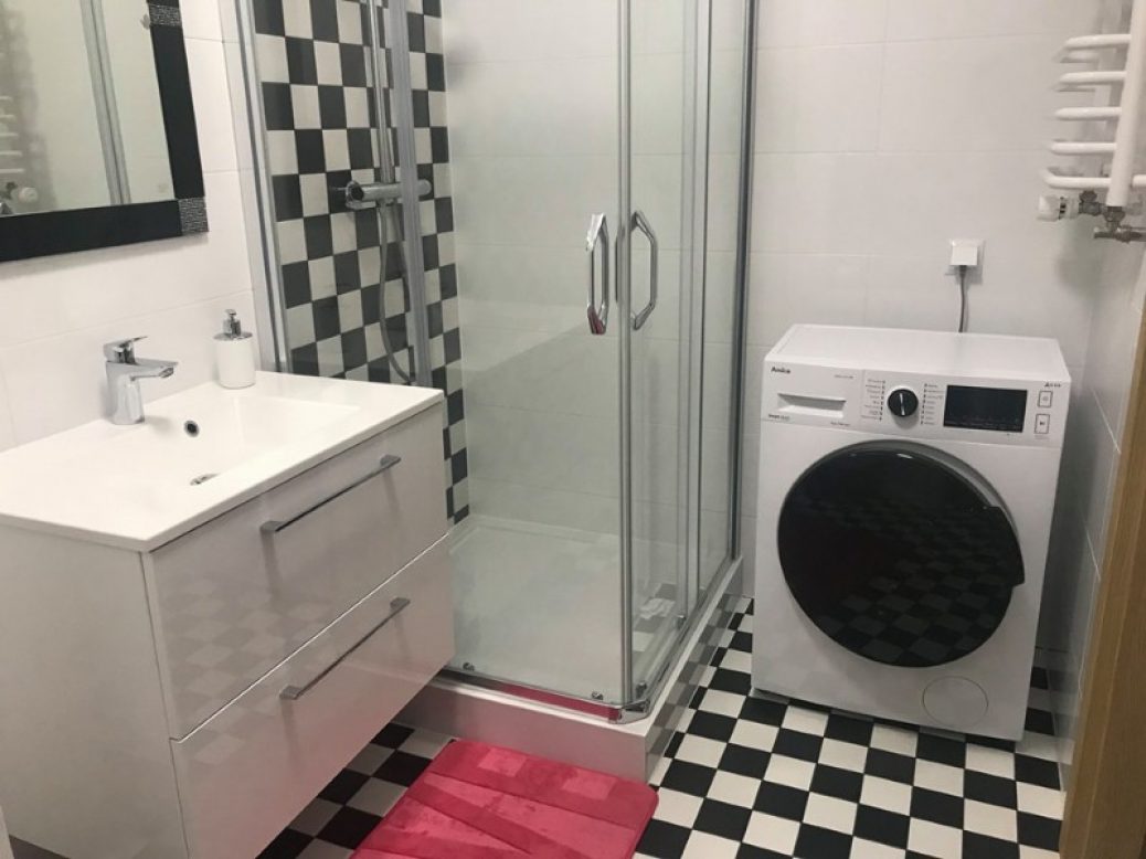 Łazienka wyposażona jest w prysznic, toaletę, umywalkę z szafką oraz pralkę.