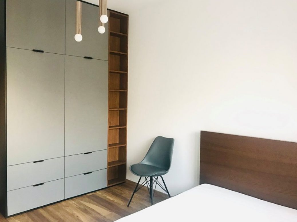 Pierwszy pokój zawiera duże łóżko oraz szafę.