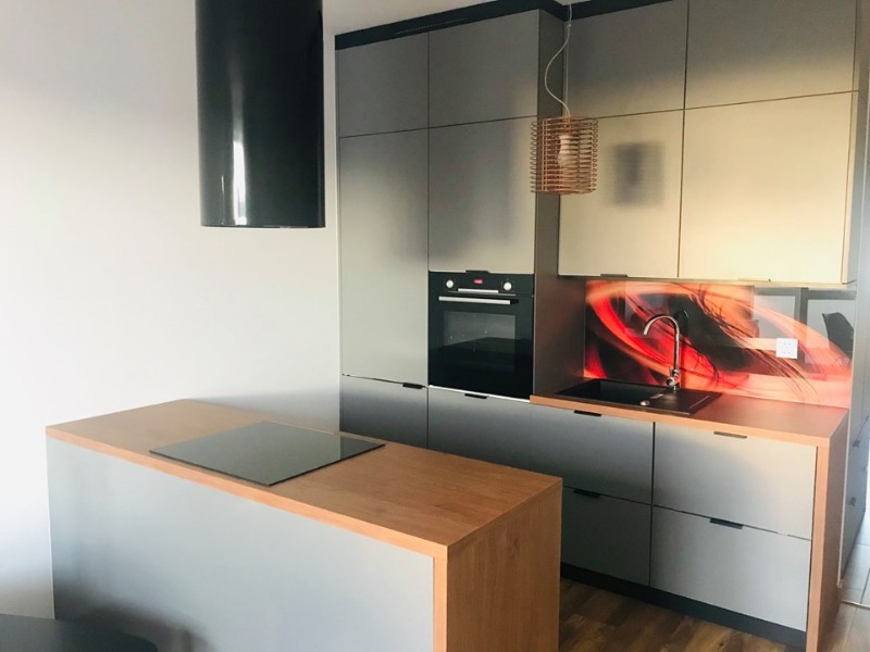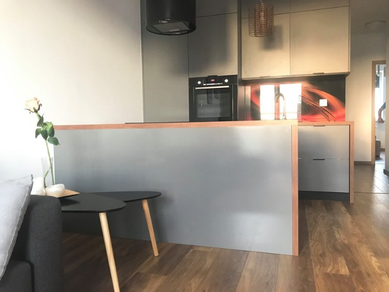 Kuchnia wyposażona jest w niezbędne sprzęty AGD (zmywarka, piekarnik, kuchnia indukcyjna, lodówka).