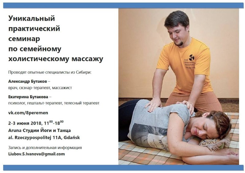 Запрошуємо навчитися простим і доступним масажним технікам, які не вимагають спеціального обладнання або особливих умов. На семінарі ви отримаєте нові знання, нові вміння, новий погляд на своє тіло і взаємини з іншими людьми. Буде корисно всім тим, хто хоче допомагати своїм близьким (і, звичайно, в тому числі дітям) почувати себе добре, налагодити тілесний контакт, допомогти зняти напругу і біль, заспокоїти.