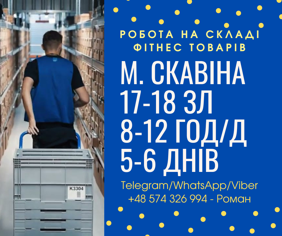 РОБОТА ДЛЯ ЧОЛОВІКІВ НА СКЛАДІ НОВОРІЧНИХ ПРИКРАС І ФІТНЕС АКСЕСУАРІВ Місце роботи : Краків, Скавіна. Місце проживання : Скавіна, Краків Місце оформлення : Краків Вигляд договору : Umowa zlecenia Переваги : 1. Молодий колектив  2. Робота на сучасному обладнанні, що не вимагає додаткових навичок та знання мови. 3. Медична страховка від роботодавця (ZUS).  4. Легальна робота за контрактом.  5. Допомагаємо з легалізацією (Карта побуту та дозвіл на роботу). 6. Ми надаємо вам координатора.  Заробітна плата : 18 zl/год для чоловіків 17 зл/год для дівчат 22,80 zl НЕТТО для студентів! (за підтвердженням з деканату польського ВНЗ та легітимації) Заробітна плата з 15 по 18 число кожного місяця.   Обов’язки : збирання новорічних прикрас або фітнес аксесуарів згідно зі списком, що вказаний на екрані сканера, товари лежать на стелажах, їх потрібно вкласти в кошик і покласти на спеціально виділене місце для подальшого пакування. Фіз.навантаження: Особливого фізичного навантаження немає, але працівники складу ходять багато і комплектувати замовлення потрібно швидко. Графік : 8-12 годин/день, залежить від кількості замовлень, 5-6 днів на тиждень. Зараз працюють тільки у денні зміни • Одна оплачувана перерва на обід – 30-40 хвилин (кухня є).   Проживання: 350 zl/міс. • У кімнатах по 3 – 4 особи  • Чоловіки/жінки окремо • Житло комфортне, є гаряча вода, зручні ліжка, кухня  • Якщо власне житло – +200 злотих у вашій заробітній платі  • Про заселення сімейної пари до окремої кімнати для пари за погодженням Робоча форма : Ваша, зручна для роботи (наприклад – спортивний костюм) Фірма видає раб.жилет та робоче взуття вашого розміру (За заходами безпеки – захисне взуття з металевими пластинами) Температура на складі : кімнатна, але в зимовий час краще одягатися тепліше Документи, необхідні для оформлення : Закордонний паспорт ***Якщо ви в’їхали по ID карті або паспорту старого зразка, то на оформлення приходити в офіс з паспортом старого зразка або ID карткою. Песель (роздруківка) Знати номер польського банківського рахунку ***Якщо у вас немає банківського рахунку то потрібно відкрити в будь-якому банку або ми вам допоможемо це зробити Якщо студент польського ВНЗ : актуальна, підбита legitymacja (студентська) та актуальне Zaświadczenie з ВНЗ не старше одного місяця, власна страховка. У разі відсутності номера PESEL або банківського рахунку обов’язково попереджати перед оформленням! ВАЖЛИВО : Також для виходу на роботу потрібно пройти медогляд! Вартість медогляду – 150 злотих, робимо на місці під час оформлення, оплата також на місці під час оформлення. Гроші за медогляд повертаються після 3 місяців роботи Якщо у вас дуже важка фінансова ситуація, є можливість списати оплату медогляду з першої зарплати.