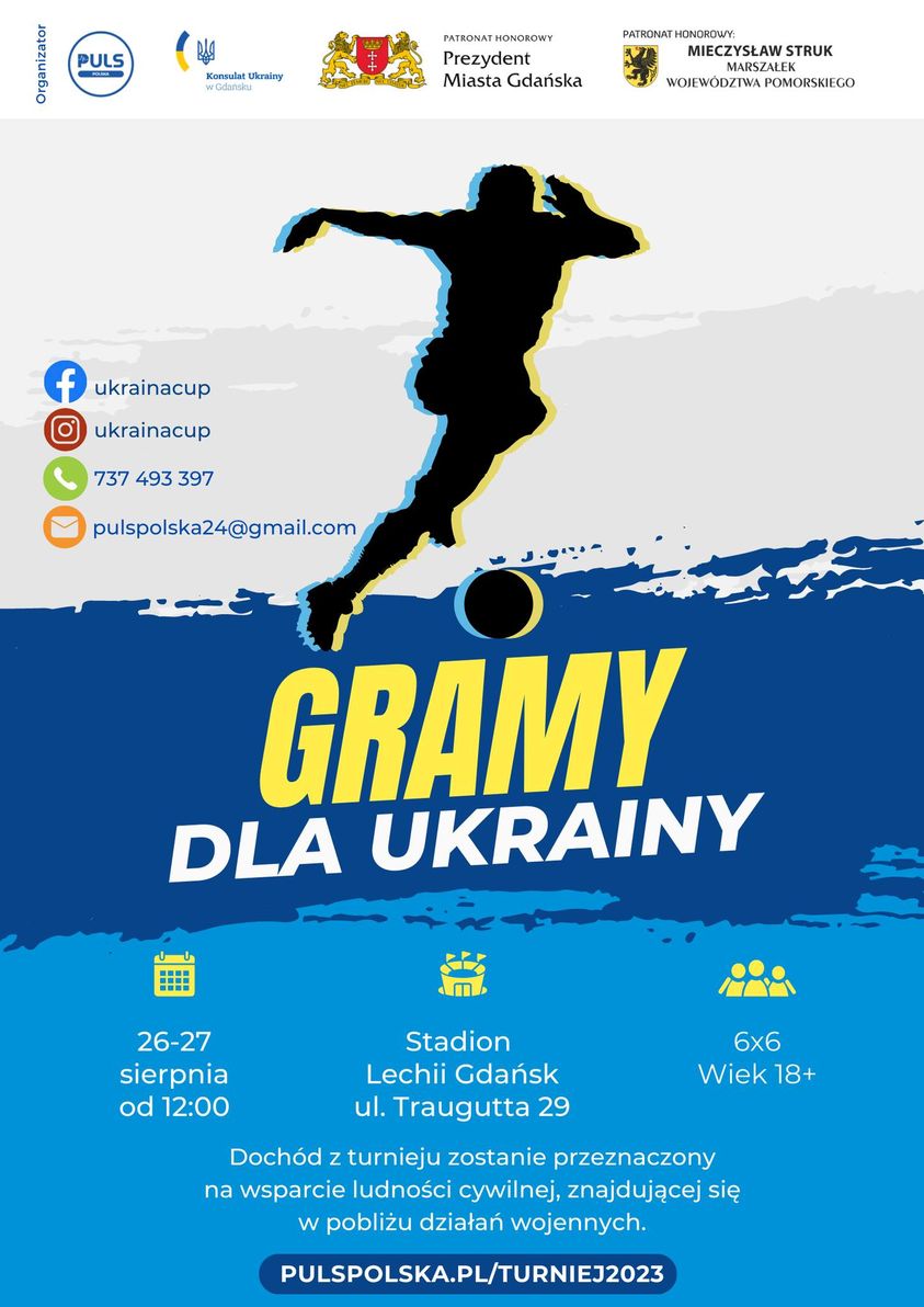 25-27 серпня у Гданську, на стадіоні Lechii Gdańsk (ul. Traugutta 29) відбудеться благодійний футбольний турнір “Граємо для України” у поєднанні зі збором за Україну. У футбольному турнірі можуть брати участь 16 команд, які змагатимуться загонами по 6 осіб, а матчі триватимуть 2×15 хвилин.